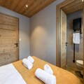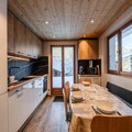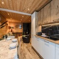 Inside, the 55m² apartment is thoughtfully designed to accommodate up to four guests. The fully equipped kitchen, complete with a Nespresso coffee machine, dishwasher, and induction hob, opens directly onto the garden, creating a seamless indoor-outdoor living experience. The dining area and cozy living room, featuring a wood-burning stove and television, provide the perfect space to unwind after a day of adventure. The two double bedrooms, one with an en-suite shower room and WC, promise restful nights, while the additional bathroom ensures comfort for all guests. Modern amenities such as Wi-Fi, a laundry room, and ski storage add to the convenience of your stay.