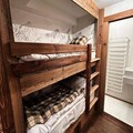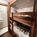 The lower level includes three bedrooms: a double bedroom with a 160x200 bed and en-suite shower room, a spacious double bedroom with a 180x200 bed, a bathtub, and en-suite shower room, and a children's bedroom with 90x200 bunk beds and an en-suite shower room. The apartment also includes independent toilets on this floor, providing additional convenience.Additional amenities include a laundry room, covered parking with ski storage and boot dryers, and high-quality household linens. The apartment is non-smoking and pets are not allowed. Guests are greeted with a warm reception at the agency, and end-of-stay cleaning is included.
