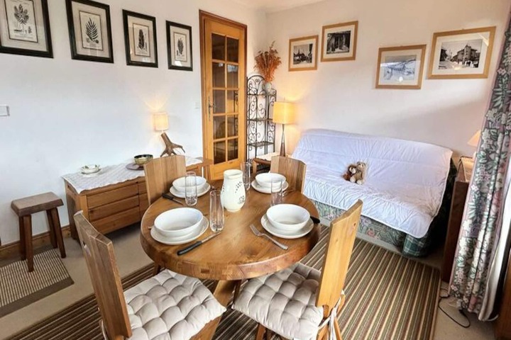 Inside, the apartment is thoughtfully designed for comfort and relaxation. The welcoming living and dining area features a plush double sofa bed, a flat-screen TV, and access to a west-facing balcony where you can unwind with a warm drink as the sun sets over the mountains. The separate, fully equipped kitchen is perfect for preparing hearty meals after a day of exploring. The bedroom, complete with a comfortable double bed, ensures restful nights, while the bathroom and separate toilet add to the practicality of the space. Additional amenities include Wi-Fi, a private garage, a ski locker, and even a golf locker for your convenience.