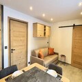 The apartment is thoughtfully designed to maximize comfort and convenience. It features a welcoming living and dining area with a comfortable sofa bed (140x190), a flat-screen television, and a dining space for intimate meals. The fully equipped kitchen invites you to prepare hearty breakfasts or gourmet dinners after a day of exploration. A modern bathroom with a toilet completes the space, ensuring a relaxing stay. Guests also benefit from a private, numbered outdoor parking space (no. 103), adding to the ease of access.