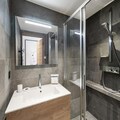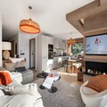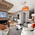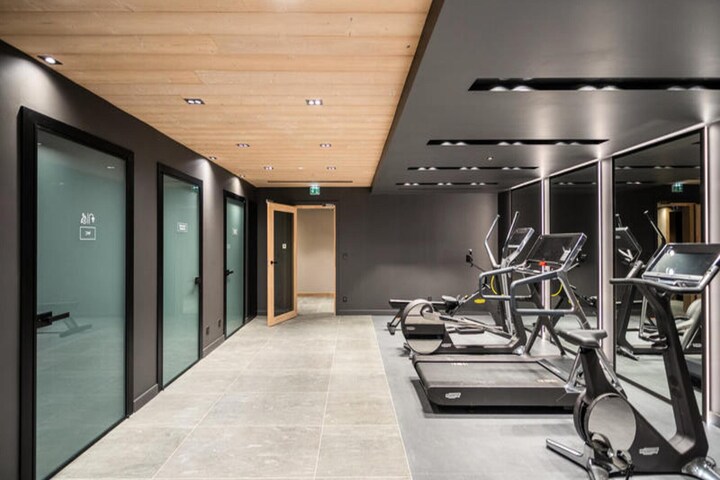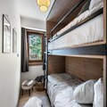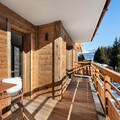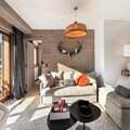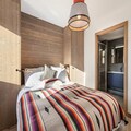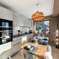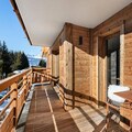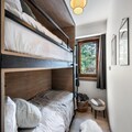 The apartment comfortably accommodates up to 6 guests with two double bedrooms and a cabin with two bunk beds. The spacious living area features an open kitchen, dining area, and lounge, all leading to a terrace equipped with outdoor furniture and offering stunning panoramic mountain views. Guests can enjoy a wellness area within the residence, complete with a sauna, hammam, and fitness room. Additional amenities include a ski locker with boot dryers and a covered parking space.