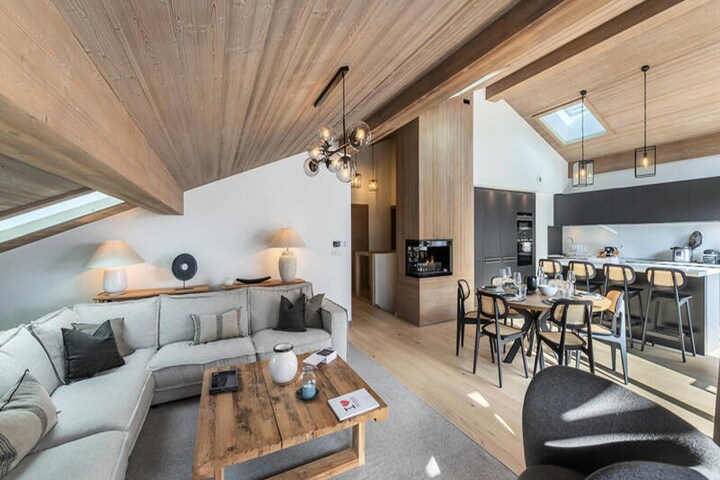 This spacious 100m² triplex apartment accommodates up to 12 guests. It features a cozy living room with a fireplace, TV, and a balcony, plus a dining area connected to the kitchen. The property includes three outdoor parking spaces, a ski storage area with a shoe dryer, and offers essential services like end-of-stay cleaning and linens. Pets are not allowed.