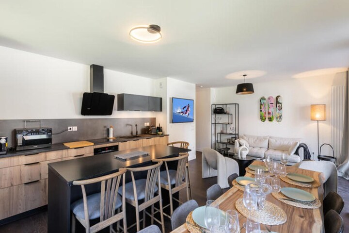 This newly built 100m² apartment in the Villaret area of Megève offers a spacious and welcoming retreat, perfect for families or small groups. Located just a 15-minute walk from the village center, it boasts a bright, open layout with a well-equipped kitchen and a comfortable living area. The apartment features two double bedrooms, including a master with an en-suite shower room, and a child’s bedroom with three single beds. The apartment also has a separate bathroom with two sinks and independent toilets. A balcony provides a great space to enjoy the surrounding alpine beauty.