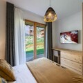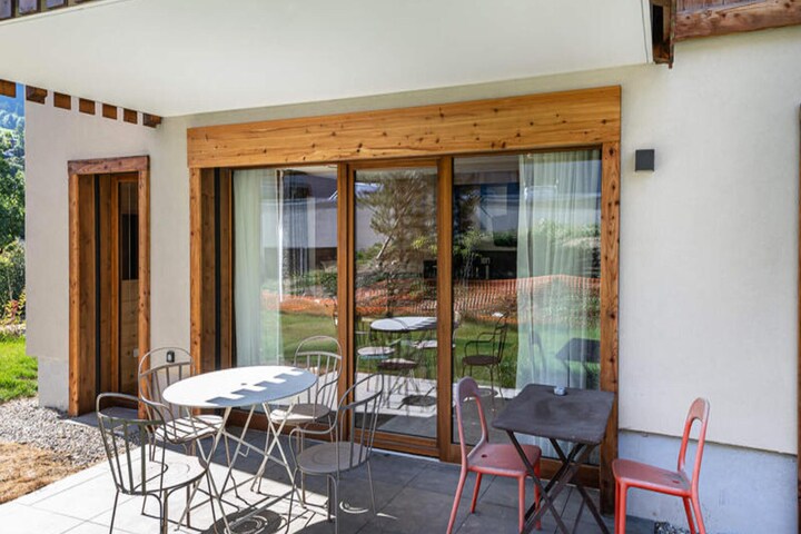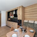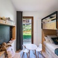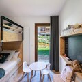 With tasteful décor and modern amenities, it features a double bedroom with a TV and desk, as well as a children's room with 4 single beds (a twin and a bunk bed), accommodating up to 4 adults and 2 children. The bright living area is equipped with a connected TV, perfect for unwinding after a day on the slopes or exploring the area. It opens onto a lovely terrace, providing a perfect spot to enjoy the fresh air and surrounding nature. The apartment includes a separate bathroom and a ski locker for convenience. Additional perks include two parking spaces in the garage and regular cleaning services. Pets are welcome, and the residence is non-smoking.