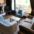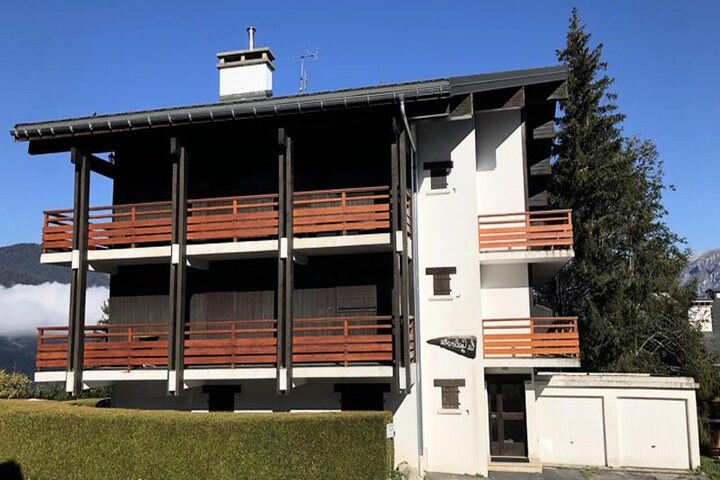 This spacious 65 m² apartment, located on the second floor of a building, offers a comfortable retreat for up to six guests. The apartment features a bedroom with a double bed, two twin bedrooms (one with a sofa bed and the other with bunk beds), and a cozy living room with a dining area and television. Enjoy the stunning views of the Mont-Blanc range from the balcony. The property is pet-friendly, allowing you to bring your furry companions along for your stay. Please note that snow tires or chains are mandatory in winter months for access.