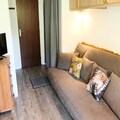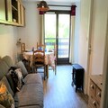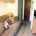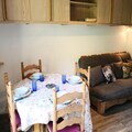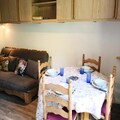 "This charming 20 m² studio cabin is ideal for a family or group of friends, accommodating up to 4 people. It features a living room with a sofa bed for 2, a dining area, and a cabin with bunk beds. The studio is non-pet-friendly and includes essential amenities such as pillows, duvets, blankets, and kitchenware. Additional services like linen rental, childcare equipment, and end-of-stay cleaning are available at an extra cost.