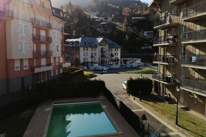 Where the majestic Mont Blanc stands as a sentinel, this charming apartment in Saint-Gervais offers an unforgettable alpine escape. Imagine waking up to the crisp mountain air, sipping your morning coffee on a southwest-facing balcony, and planning your day of adventure in the Evasion Mont-Blanc ski area, accessible via the Saint-Gervais cable car just 50 meters away. Whether you're seeking thrilling slopes or tranquil summer hikes, this residence provides the perfect base for exploring the beauty of the French Alps. \n\nThe apartment, located on the second floor, is thoughtfully designed to accommodate up to six guests. Its cozy layout includes a living room with a comfortable sofa bed, a well-equipped kitchen featuring modern appliances like a dishwasher and ceramic hob, and a dining area for shared meals. The bedroom with twin beds and a cabin with bunk beds ensure restful nights for all. Two bathrooms, including one with a bathtub, and a separate toilet add convenience to your stay. Additional amenities such as a ski locker and garage make it ideal for winter sports enthusiasts, while the heated outdoor pool, open during summer, promises relaxation under the alpine sun.\n\nSaint-Gervais itself is a delightful village just 800 meters away, brimming with local charm. Nearby, you'll find a bakery, tobacconist, and sporting goods rental shops, ensuring all your needs are met. In summer, the region transforms into a haven for outdoor enthusiasts, offering scenic trails, vibrant festivals, and breathtaking views of Mont Blanc. For added comfort, optional services like Wi-Fi, linen rental, and childcare equipment are available, making this property perfect for families and groups of friends.\n\nWhether you're carving through snowy slopes or basking by the pool, this apartment invites you to create lasting memories amidst the awe-inspiring landscapes of Saint-Gervais.