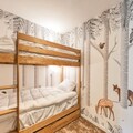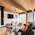 Inside, the chalet boasts a thoughtfully designed layout across three levels. The main living area features a cozy fireplace, a spacious dining room, and an open-plan kitchen equipped for culinary delights. Five beautifully appointed bedrooms, including one with bunk beds, ensure restful nights for all. The master bedroom on the ground floor includes an en-suite bathroom with a double vanity, while other bedrooms offer balconies and televisions for added comfort. Modern amenities such as Wi-Fi, a laundry room, and a garage enhance the convenience of your stay.