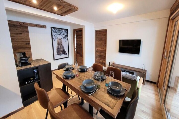 In the heart of the charming alpine village, L'Essentiel offers a harmonious blend of elegance, comfort, and practicality. This exclusive residence is perfectly situated for a car-free holiday, with shops, restaurants, and ski lifts just steps away. Imagine waking up to the crisp mountain air, enjoying breakfast on the spacious sheltered terrace, and setting off for a day of adventure in the French Alps, all without the need for a car. The atmosphere here is both refined and welcoming, making it the perfect retreat for families or friends.