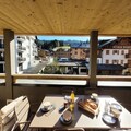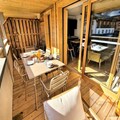 Inside, the apartment is thoughtfully designed to accommodate up to six guests, including two children. The bright and airy living area features a cozy lounge, a dining space, and a fully equipped open-plan kitchen, all leading to the large north-east-facing terrace. The sleeping arrangements include an en-suite master bedroom with a double bed, a second bedroom with two single beds that can be joined, and a charming cabin area with bunk beds for children. Modern amenities such as Wi-Fi, a Nespresso coffee maker, and a raclette grill ensure a comfortable and enjoyable stay.