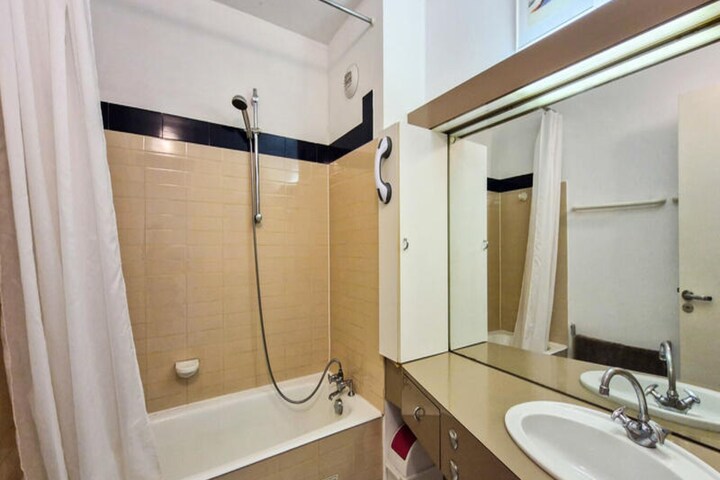 The 48 m² south-facing apartment is thoughtfully designed for up to six guests. The bedroom features a set of bunk beds and two single beds, while the living room offers a comfortable double sofa bed. A modern open-plan kitchen, equipped with an oven, microwave, and dishwasher, makes meal preparation a breeze. Relax in the spacious living area with a flat-screen TV, built-in DVD player, and free Wi-Fi, or unwind on the beautiful wooden terrace that captures the warmth of the sun throughout the day. Additional amenities include a bathroom with a bathtub, separate toilet, and a convenient ski locker. Please note that pets and smoking are not permitted, and bed linen and towels are not provided.