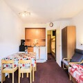 The studio, thoughtfully designed for up to four guests, features a welcoming living room, a well-equipped kitchen, a comfortable sleeping alcove, and a modern bathroom. Its compact yet functional layout ensures a comfortable stay, while the Maeva Home Comfort Label guarantees excellent value for money. Essential amenities such as a cleaning kit are included, and additional services like bed linens, towels, and end-of-stay cleaning can be arranged for your convenience. Whether you’re preparing a hearty breakfast before hitting the slopes or unwinding with a warm drink after a day of adventure, this space feels like a home away from home.