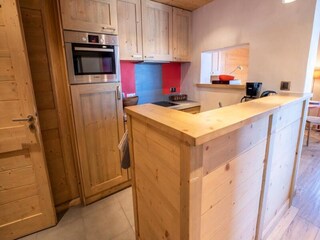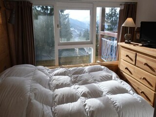 "Chalets des Cimes", 3-room apartment 46 m2. Cosy furnishings: living/sleeping room with 1 sofabed, 1 pull-out bed, dining table and TV can be hired. 2 rooms, each room with 1 french bed. Alcove with 1 x 2 bunk beds. Kitchenette (4 hot p...