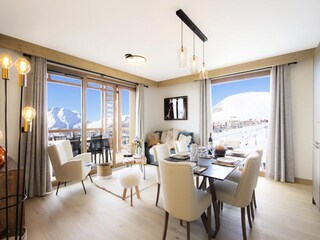 "Odalys Référence Le Grand Panorama 1", 3-room apartment 35 to 40 m2. Rustic furnishings: living/sleeping room with 1 sofabed, 1 pull-out bed, dining table and TV (flat screen). Exit to the balcony. 1 room with 1 french bed (140 cm, leng...