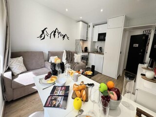 "Bâtiment B", 3-room apartment 40 m2 on 5th floor, south facing position. Cosy furnishings: living/dining room with 1 pull-out bed (2 pers. 2 x 80 cm, length 190 cm), TV (flat screen). Exit to the balcony, south facing position. 1 room, ...