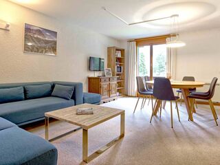 The cosy 3.5-room apartment (60m2) has two bedrooms with two single beds and a bathroom with shower and toilet. The open kitchen leads to the cosy dining/living area. The balcony offers a great view of the mountain panorama. The house i...