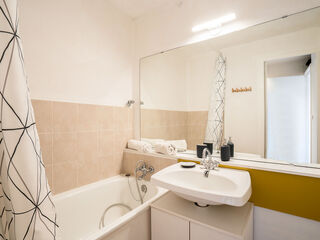 "Bâtiment B", 3-room apartment 40 m2 on 5th floor, south facing position. Cosy furnishings: living/dining room with 1 pull-out bed (2 pers. 2 x 80 cm, length 190 cm), TV (flat screen). Exit to the balcony, south facing position. 1 room, ...
