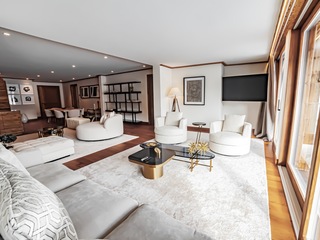 "Le Refuge 1", 6-room maisonette 200 m2 on 1st floor. Spacious, luxurious furnishings: large living/dining room with panoramic window north facing position and west facing position with open-hearth fireplace. Exit to the balcony. Large, ...