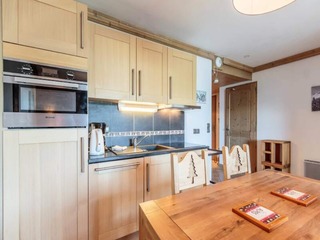 This charming holiday apartment in Les Menuires offers a warm and cozy atmosphere with a living area that includes a sofa bed and armchair, a mezzanine with two single beds, and two bedrooms: one with a double bed and the other with two ...