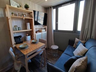 1-room apartment 28 m2 on 3rd floor. Practical and comfortable furnishings: living/dining room with 1 x 2 bunk beds (70 cm), 1 pull-out bed (2 pers. 2 x 80 cm), TV (flat screen), DVD. Kitchenette (2 hot plates, microwave, electric coffee...